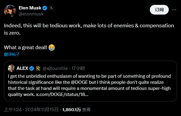 马斯克还转发了其他X用户说起该公告的帖子,并辩驳说念:“确乎,这将是繁琐的使命,会成就许多敌东说念主,且薪酬为零。太合算了。”马斯克这里的“太合算了”是要强调这是一份枉尽心机的使命。