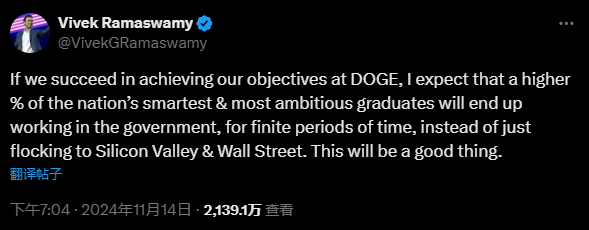 拉马斯瓦米认为,政府效果部能让好意思国国内更多“最智慧的、最有抱负的毕业生在政府部门使命一段技术,而不是一窝风地涌向硅谷和华尔街。这将是一件功德。”
