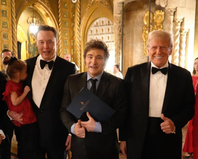 马斯克的思法不难让东说念主思到也曾将“精简政府部门”付诸实行的阿根廷总统米莱。就在周四今日,米莱和马斯克双双出席了特朗普在海湖庄园举办的晚宴,米莱担任了演讲嘉宾并与特朗普和马斯克互动合照。