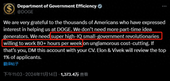 政府效果部补充称,校阅者要满足每周使命80小时以上,专注于无聊的资本削减使命,“要是以为咱们说的即是你,那请将简历私信发送到这个账号,埃隆和维韦克将审核前1%的请求东说念主。”